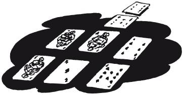 После этого снова соберите карты и разложите их на 4 части, причем та, что была верхней в первой части, снова должна оказаться в том же положении. Несоответствующие масти опять нужно отбросить.