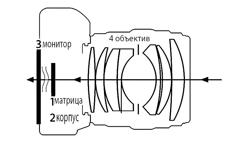Беззеркальные камеры – это профессиональные и любительские фотоаппараты со сменной оптикой или со встроенными объективами, матрицами полноформатными или кропнутыми (с размерами кадрового окна от 24х16 мм – до половины диагонали полного формата). Визирование сюжета осуществляется, в основном, по двум экранам монитора – оба Live view. Один установлен на задней стенке камеры, второй (если есть) – в глазке видоискателя (см. схему 2).