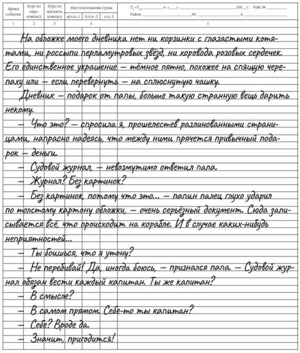 Папа – моряк. А также путешественник, механик, слесарь, электрик, радист, повар, спасатель и даже певец. Он говорит, что моряк должен уметь всё: прокладывать курс, чинить лебёдку, предсказывать погоду, молчать, коптить рыбу, радоваться жизни, ставить парус, защищаться, беседовать с ветром, понимать чужие языки и, конечно, отлично плавать. Там ещё много чего – всего не перечислить. Иначе, по его мнению, пропадёшь. Ах да! Как же я забыла знаменитое «Чудес не бывает», а также «Надейся только на себя» и самое любимое «Овёс к лошади не ходит». Нет, всё-таки главные любимчики – это «Работа и Результат». Эту рр-рычащую парочку я просто ненавижу, даже больше, чем «уу» – «Уроки и Уборку».