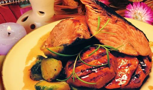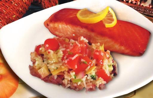 Филе лосося нарезать порционными кусками, полить лимонным соком, оставить на 10 минут, натереть солью и белым перцем. Выложить в сковороду с оставшимся разогретым оливковым маслом, жарить на сильном огне до готовности. Подать к столу с рисовой смесью, украсить ломтиками лимона.