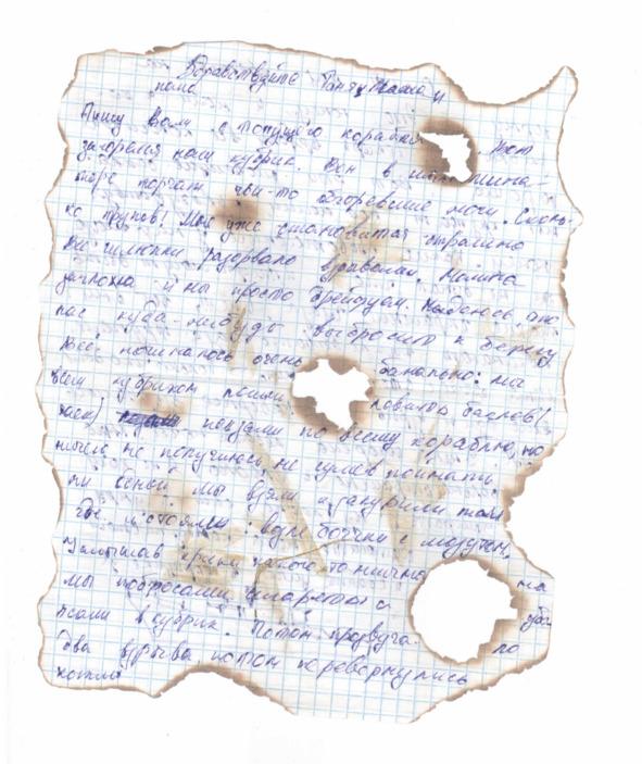 Вчера получили письмо от сына. Он у нас учится в Военно-морском институте радиоэлектроники в Санкт Петербурге. Три недели назад он предупредил, что их курс уходит на практику на учебном корабле, и чтобы мы не беспокоились: связи не будет. Сотовые, которые и без того под запретом, забрали. Письмо смогу отправить, если только будет сход в каком-нибудь порту. И вдруг это письмо!