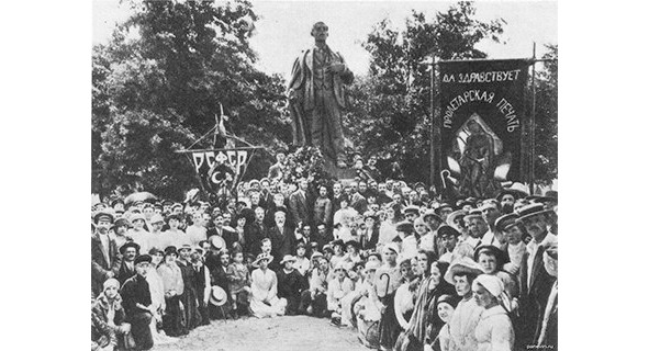 — «На углу Конногвардейского бульвара — памятник Володарскому. Он из гипса, под него в прошлом году подложили бомбу и вырвали ему живот, починить нечем, оставить так — неуважительно, снять — распоряжения ждут, а пока закрыли его рваной тряпкой, которая под метелью, на ветру, хлещет в разные стороны, машет, грозит, зовёт и кланяется».