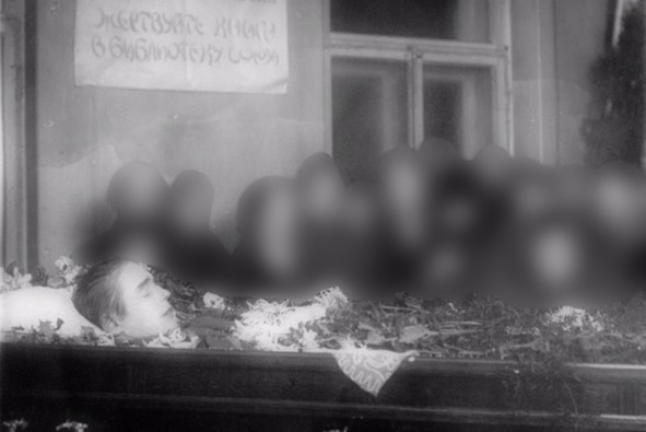 Но что тут снимать — толчея, духота, небольшая комната, голые стены, два тёмных окна на Фонтанку без штор, в центре гроб на рояле, ёлка в углу, плакат на стене, «… жертвуйте книги в библиотеку союза» —