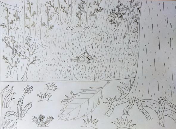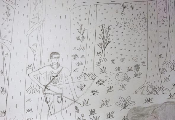 Фёдор сидел на камне с задумчивым лицом: «Так, меня засосало в дыру и теперь я в каком-то лесу. Если учесть всю эту фантастику, которая теперь ещё и явью стала, то я даже могу находиться в другом мире. А это значит, что помощи мне точно ждать не стоит. И из всего инвентаря и сумки у меня ровно: 1 шоколадка со вкусом клубники, 2 батона белого хлеба, 2 баночки законсервированных шпротов, 1 сэндвич с бужениной, духи с очень резким запахом, моток прочной верёвочки, миниатюрный медный кулон и 15 листов белого картона. Если экономить, то еды мне хватит максимум на два дня. И среди этой пищи ни единой бутылки воды!» Фёдора привлёк кулон, изготовленный из меди, и имеющий вид миниатюрного меча: «это конечно глупо, но если его наточить, то возможно я смогу им что-нибудь нарезать.» Он подошел к большому обломку и начал точить кулон. «Ок, теперь у меня есть ножик.» — с этими словами Фёдор посмотрел на свой инвентарь, и начал делать что-то интересное. Он достал из обломков длинный, но тонкий деревянный шест, который немного напоминал дугу. Сделал в нём зазоры с обеих сторон. Потом Фёдор начал отмерять длину верёвки. Через пару минут он держал в руках самодельный лук, а также он сделал 4 стрелы из прямых веток и белого картона. Однако жизнь такова, что прямых веток больше не оказалось, а Фёдор за всю свою не долгую жизнь ни разу не стрелял из лука. В общих чертах он будет крайне неумелым стрелком.