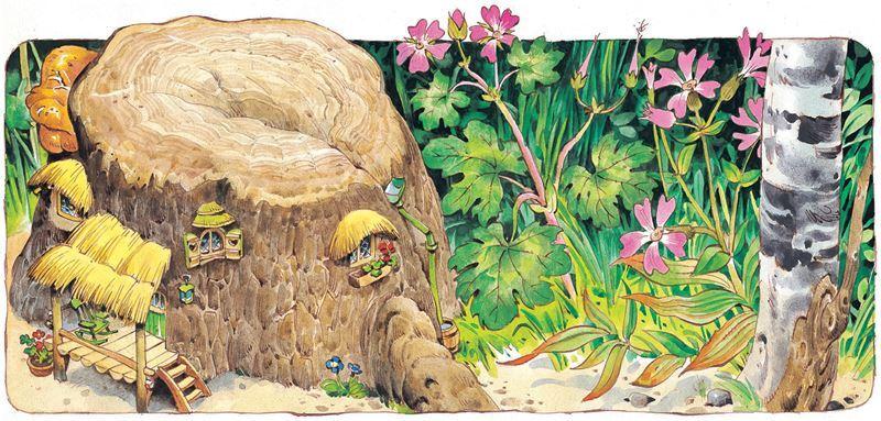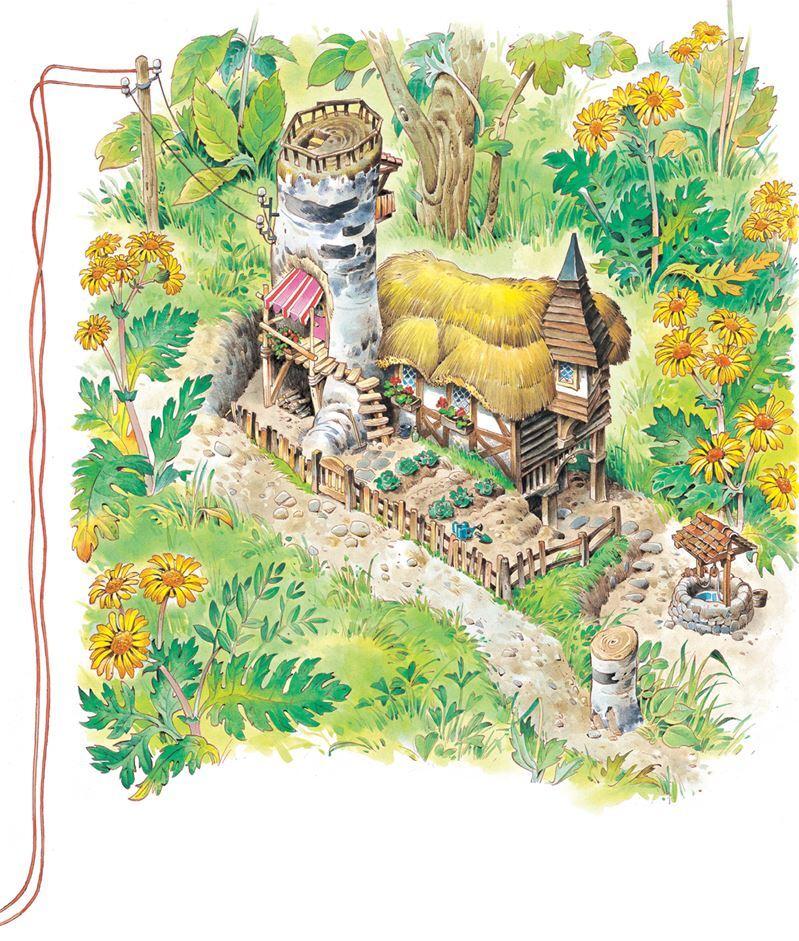 Над этой крышей возвышался стройный пенёк спиленной берёзы, служивший башней. С её вершины открывался чудесный вид на цветущую поляну и светлую речку вдали.