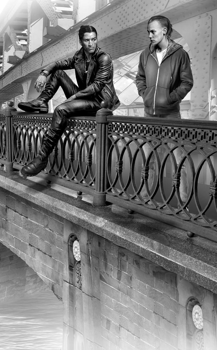 Шагах в пяти справа от себя молодой человек обнаружил мужчину лет сорока, непринужденно сидящего на перилах и свесившего ноги в сторону реки. Обоих можно было принять за собратьев по духу с той разницей, что мужчина был изжелта-смугл, горбонос, одет в черную кожаную куртку и черные же кожаные брюки, бороды не имел вовсе, а перетянутый резинкой хвост на затылке отливал не блеклой соломой, а вороненой сталью.