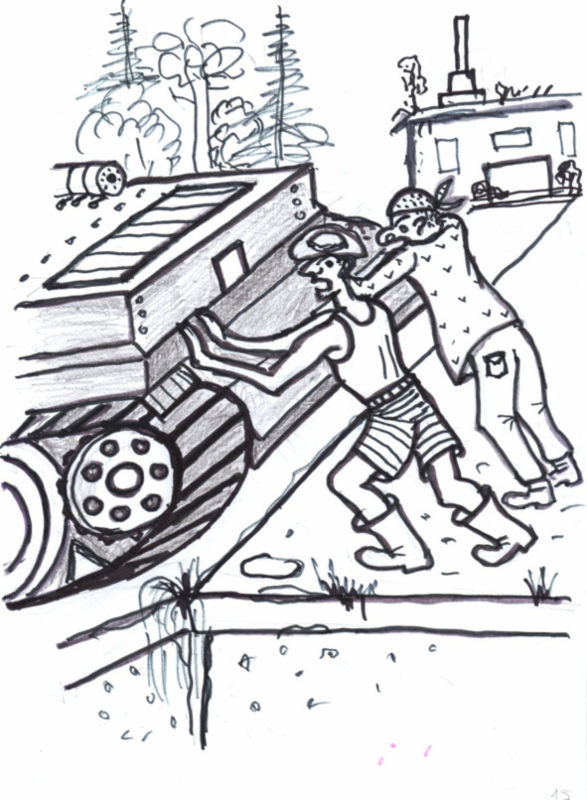 Рано утром деда Сергея разбудило не щебетание птиц и не лучи солнца, а разбудило его резкое лязганье железа. То шумел Константин Викентьевич. Поднявшись ни свет, ни заря, он поспешил взгромоздиться на свою любимую технику, чтобы приступить к её активному освоению. Нависнув над двигателем, танкист долго его протирал, что-то в нем подкручивал, затем переместился к фрикциону и коробке передач. Закончив копаться в силовой установке и трансмиссии, он приступил к смазке всего и вся. Особенно обильно поливалась соляровым маслом ходовая часть. Там смазывалось все, вплоть до резиновых бандажей на катках.