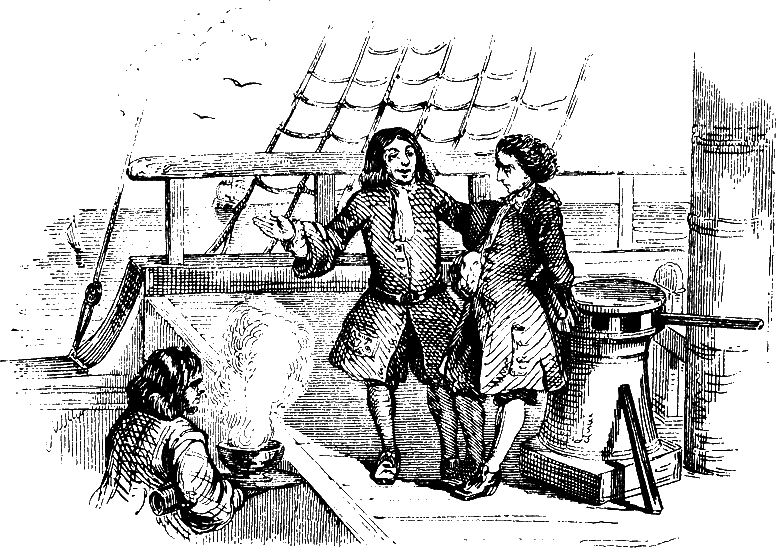 Около трех часов пополудни разбойничий корабль догнал нас, но пираты сделали большую ошибку: вместо того чтобы подойти к нам с кормы, они подошли с левого борта, где у нас было восемь пушек. Воспользовавшись их ошибкой, мы навели на них все эти пушки и дали залп.