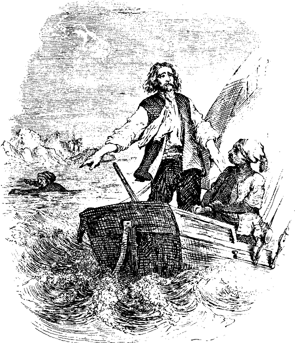 Я же сидел за рулем, на корме, и, когда судно отошло мили на три в открытое море, я лег в дрейф[9] – как бы для того, чтобы снова приступить к рыбной ловле. Затем, передав мальчику руль, я шагнул на нос, подошел к мавру сзади, внезапно приподнял его и бросил в море. Он сейчас же вынырнул, потому что плавал, как пробка, и стал кричать мне, чтобы я взял его в шлюпку, обещая, что поедет со мною хоть на край света. Он так быстро плыл за судном, что догнал бы меня очень скоро (ветер был слабый, и шлюпка еле двигалась). Видя, что мавр скоро догонит нас, я побежал в каюту, взял там одно из охотничьих ружей, прицелился в мавра и сказал: