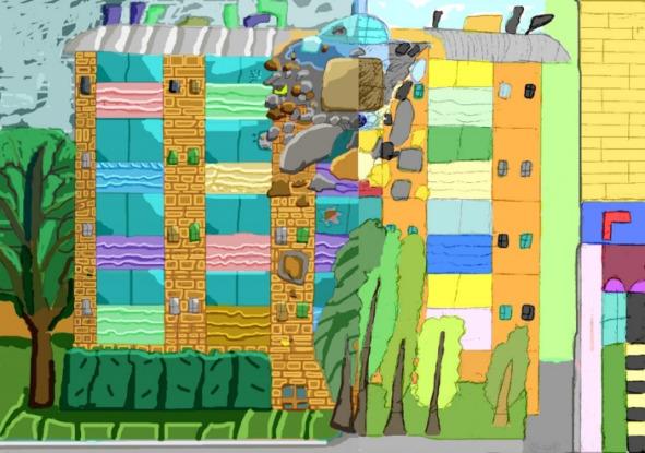 Дописав одну страницу и почти закончив вторую, я почувствовал, как все затряслось. Все вещи попадали вниз. Землетрясение — подумал я. Начал уже собираться скорее вниз, но оно все усиливалось. И вдруг, смотрю в окно, а там летит самолет. Да, настоящий САМОЛЕТ, в квартиру на 4 этаже. Интересно, чтобы вы сказали в этот момент? ^R^ . В квартиру влетает самолет и последний звук, который я услышал был «ДЭН». Я падаю на пол… От того, что самолет врезался, дом начал разрушаться. Самолет начал проходить сквозь квартиру и осколки уже начали падать на землю. И тут, трещина прошла по основанию дома и дом начал медленно падать.