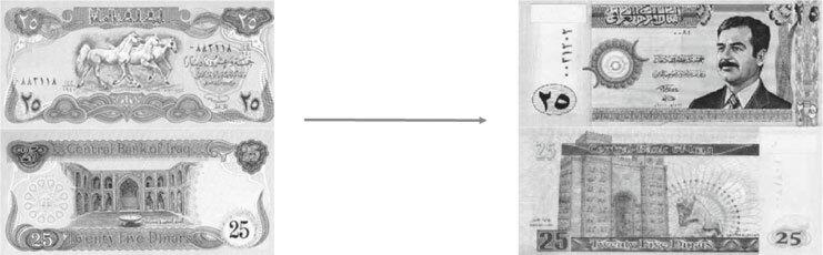 В качестве относительно недавней иллюстрации можно привести швейцарский динар, который был валютой Ирака до первой войны в Персидском заливе, начавшейся в 1990 году. Печатные формы производились в Швейцарии (откуда и название валюты), а собственно деньги печатались в Соединенном Королевстве. В 1991 году Ирак был разделен: курды стали контролировать север страны, а Саддам Хусейн – юг. Из-за санкций Ирак не мог импортировать динары из Великобритании и был вынужден наладить их местное производство. В мае 1993 года Центральный банк Ирака объявил, что у граждан есть три недели на то, чтобы обменять старые банкноты номиналом 25 динаров на новые (см. рис. 2.2). По истечении этого срока старые динары становились недействительным средством оплаты.