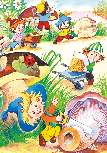 В то тёпленькое утро Цветочный город проснулся раньше обычного. Накануне cтало известно, что лес на другом берегу Огурцовой реки полон грибов: белых и лисичек, волнушек и маслят, опят и груздей. Наступило самое время грибы собирать. Хотя делать это коротышкам было нелегко. Ведь приходилось пилить грибы на части и тащить их домой по кусочкам.