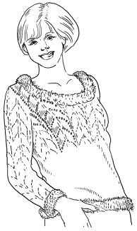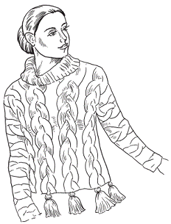 Сборка. По вырезу горловины наберите на круговые спицы 96 (100) петель и вяжите резинкой. На высоте воротника 23 см все петли закройте по рисунку. Выполните боковые швы и швы рукавов. Сделайте 8 кисточек. Для каждой кисточки сложите 35 нитей длиной 22 см пополам, перевяжите верхние 2 см и пришейте кисточки к нижнему краю пуловера посередине кос.