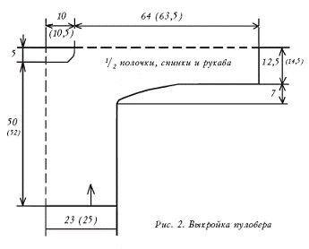Внимание! Пуловер вяжется целиком через плечи. Стрелкой на выкройке (рис. 2) обозначено направление вязания.