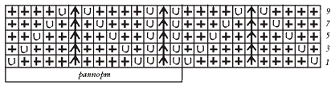 Ажурный узор: число петель должно быть кратно 8 плюс 1 плюс кромочные. Вяжите по схеме (рис. 6), на которой приведены только лицевые ряды, в изнаночных рядах все петли и накиды вяжите изнаночными. Начинайте с 1 кромочной и петель перед раппортом, повторяйте раппорт, заканчивайте петлями после раппорта и 1 кромочной. Повторяйте с 1-го по 20-й ряд.