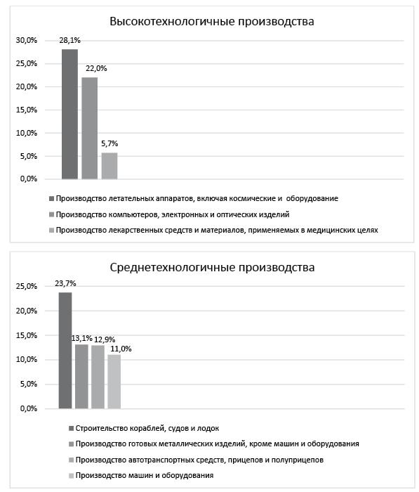 Росстат подразделяет виды производства на высокотехнологичные, среднетехнологичные и низкотехнологичные. Можно выделить сферы, где доля инновационной продукции (товаров, работ, услуг) наиболее высока. В высокотехнологичных производствах наибольшая доля инновационной продукции 28,1%. — в производстве летательных аппаратов, включая космические и соответствующее оборудование; 22,0% — в производстве компьютеров, электронных и оптических изделий; 5,7% — в производстве лекарственных средств и материалов, применяемых в медицинских целях. В среднетехнологичных производствах: 23,7% — в строительстве кораблей, судов и лодок; 13,1% — в производстве готовых металлических изделий, кроме машин и оборудования; 12,9% — в производстве автотранспортных средств; 11% — в производстве машин и оборудования. В низкотехнологичных производствах: 10,8% — в полиграфической деятельности и копировании носителей информации; 5,1% — в производстве пищевых продуктов. В сфере услуг наибольшая доля инноваций — 8,3% в деятельности в сфере телекоммуникаций и информационных технологий (см. Диаграмму 1).