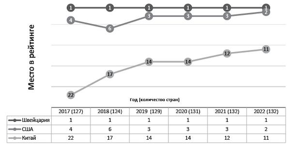 За последние шесть лет23 общемировой рейтинг устойчиво возглавляет Швейцария, а наиболее интенсивный рост за этот же период показал Китай, поднявшийся с 22 на 11 место.