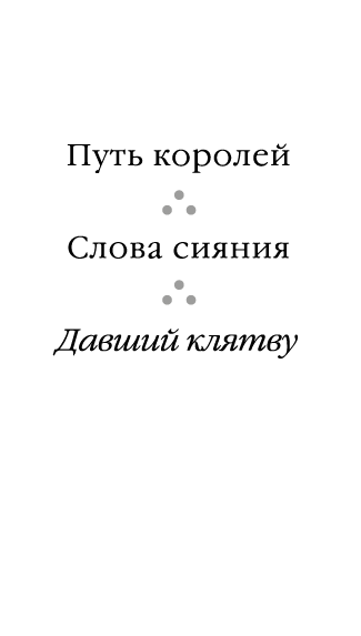 «Как же она может вот так улыбаться?» — спросил себя Каладин. Во время совместного путешествия по ущельям он узнал ее тайны. Раны, которые она скрывала. И все же... она могла каким-то образом попросту их игнорировать. У Каладина это не получалось. Даже когда он не пребывал в излишне мрачном настроении, его обременяли обязанности или нужды людей, о которых он должен был заботиться.