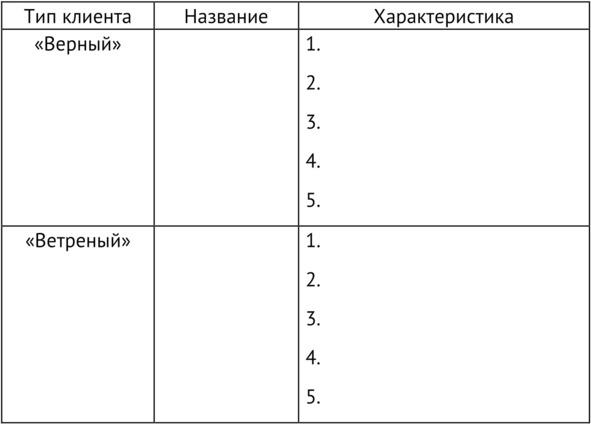 К сожалению, не только клиенты ваших конкурентов являются «ветреными», но и ваши тоже. К счастью, в вашей клиентской базе наверняка есть компании, которые можно было бы отнести к категории «верных». И поэтому ваше первое задание: опишите прилагательными, глаголами, существительными одного любого вашего клиента, которого вы считаете «верным» в вашей клиентской базе, и одного любого клиента, которого считаете «ветреным». То есть склонным к смене вас как поставщика или использованием, может быть, большего количества поставщиков, чем эти клиенты используют сейчас. С помощью пяти любых слов: существительные, прилагательные, глаголы, наречия, нецензурные выражения тоже приветствуется.