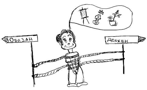 С самого раннего детства нам навязывается круг действий, которые мы обязаны совершать, независимо от наших личных желаний и внутренних потребностей. Чаще всего речь идет об элементарных вещах. Нам следует вовремя принимать пищу, вовремя ложиться спать, следить за своим внешним видом, учить уроки, быть отличниками в школе, слушаться родителей, уважать старших. Сами по себе подобные требования никак нельзя назвать неправильными или аморальными. Но дело в том, что мы зачастую вынуждены делать то, чего не желаем в данный момент или вообще. Например, садиться обедать, не испытывая чувства голода. Подчиняться практически невыполнимому и абсурдному в своей жестокости требованию: «Спи сейчас же!» Пытаться по всем предметам получать только отличные оценки, при том, что у нас попросту нет никаких способностей к изучению некоторых областей школьной науки... На это уходит масса времени и сил. Постепенно наш внутренний стержень начинает подтачиваться с разных сторон. Мы перестаем доверять самим себе, своему внутреннему голосу, своей сути.