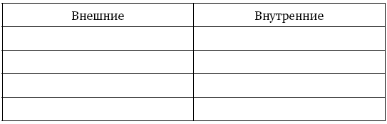 Задание. Воспользовавшись перечислениями из параграфа, выпишите по 3–4 внешних и внутренних фактора, влияние на себя которых вы замечаете особенно сильно. Выбирайте только те из них, на которые вы сможете опереться и рассматриваете как «удачные». Если очень много раздражающих факторов, или таких, на которые не хочется опираться, выпишите их ниже.