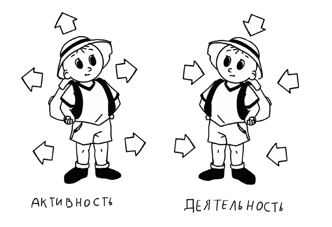 Деятельность (без активности) не связана с такой многоходовкой. Она проще, происходит по инерции, жёсткому плану, не может быть оптимальной и, конечно, обладает меньшей эффективностью.
