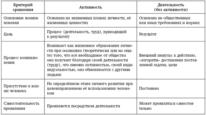 6. Но деятельность проявляется самостоятельно: встали с утра, пошли и сделали. С активностью так не получится. Во-первых, она проявляется только через деятельность. Во-вторых, активность как бы предшествуетдеятельности. Перед тем как начать действовать, человек оценивает желанность и привлекательность действия, планирует, многократно примеривает процесс будущей деятельности и «сопровождает» её в течение всего процесса осуществления, «выстраивая» варианты по ходу деятельности. В активности человек проявляет личностную заинтересованность.