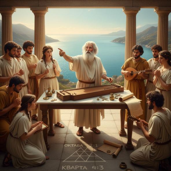 Одна из версий повествует о его экспериментах с монохордом — инструментом с одной струной. Суть не меняется: пифагорейцы обнаружили, что гармоничные музыкальные интервалы — такие как октава, квинта и кварта — могут быть выражены простыми и неизменными числовыми соотношениями длин струн. Если разделить струну в определённых пропорциях, то получаемые звуки будут идеально гармонировать друг с другом. Например, если одна струна вдвое длиннее другой, но при этом натянута с одинаковой силой, то более короткая струна издаст звук на октаву выше. Это отношение 2:1 стало символом самой базовой гармонии. Квинта, или идеальная пятая ступень, соответствовала соотношению 3:2, а кварта, или идеальная четвёртая, — 4:3.