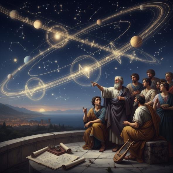 Движения Луны, Солнца и пяти известных тогда планет (Меркурия, Венеры, Марса, Юпитера и Сатурна) привели их к мысли, что эти небесные странники не просто перемещаются хаотично. Они движутся по орбитам, которые, как и длины струн монохорда, должны подчиняться строгим числовым соотношениям. Эта идея легла в основу одной из самых поэтичных и в то же время глубоко философских концепций пифагорейцев — теории о «музыке сфер». Они заметили, что планеты (включая Солнце и Луну, которые в их геоцентрической модели также считались «блуждающими светилами») движутся с разной скоростью и по разным траекториям. Однако этот порядок не был тишиной. Для ума, обостренного математическими открытиями в акустике, само это движение не могло не производить звук.