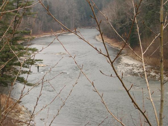 Откос вниз, ведущий к реке, с правой стороны пыльной дороги высокого перевала, зарос преимущественно вербой, ольшаником, тонкими березками и чахлыми елками. Сквозь толстую подушку прошлогодней листвы проглядывала любопытная молодая травка и сверкающие блюдца болотной водицы.