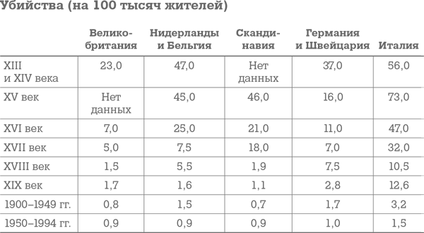 Резкое снижение этих показателей на протяжении ряда столетий дает основания считать, что мы смогли создать достаточно сильные стимулы для того, чтобы предотвратить одну из самых больших опасностей для человека — возможность быть убитым. И эти стимулы работают все лучше и лучше.