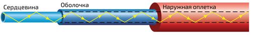 2. Распространение светового луча в оптоволокне. Передаваемый луч много раз отражается от границы между сердцевиной и оболочкой и таким образом направляется по волокну. Данные кодируются изменением интенсивности света