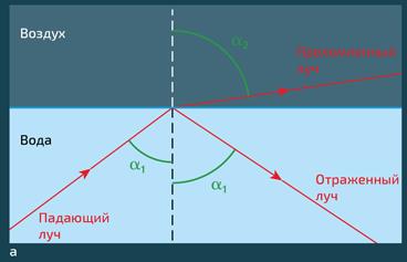 Преломление и отражение светового луча (красные стрелки), выходящего из воды (показатель преломления равен 1,33) в воздух (показатель преломления близок к 1,0)