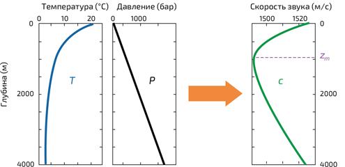 В такой жидкости, как морская вода, скорость звука зависит от ее свойств, которые неодинаковы в разных частях океана. Здесь и находится ключ к решению нашей задачи! В зависимости от содержания соли, температуры и давления воды, скорость звука варьирует от 1400 до 1540 м/с. Например, давление на глубине возрастает, что, как правило, делает звук быстрее. Также звук распространяется быстрее при более высокой температуре. Но более плотная холодная вода опускается на дно океана. Эти два противодействующих эффекта объясняют изменение скорости звука в зависимости от глубины (илл. 5). В непосредственной близости от поверхности резкое понижение температуры сначала приводит к постепенному уменьшению скорости звука c. На больших глубинах изменение температуры не так ощутимо, преобладает эффект увеличения давления, и это приводит к возрастанию c по мере приближения ко дну. Глубина zm чаще всего составляет от 1000 до 1200 м, но может достигать и 2000 м на низких широтах, где теплым остается более толстый слой воды. В высоких широтах, наоборот, zm может составлять всего 500 или даже 200 м, или еще меньше в полярных регионах. Изменение солености в зависимости от глубины, как правило, незначительно и не оказывает заметного эффекта.