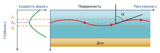 6. Акустический луч (красный), излучаемый на глубине zm, проходит между двумя плоскостями, от которых он полностью отражается. Зависимость скорости звука от глубины c (z) в океане представлена зеленой кривой. Значения z1 и z2 (считаем, что глубина равна 0 на поверхности) зависят от угла падения луча на глубине zm и определяются законом Снеллиуса: c (z1) = c (z2) = cm/sin α (zm)
