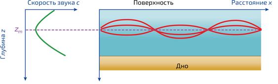 5. Пример изменения скорости звука с в океане в зависимости от глубины. В результате повышения давления и понижения температуры по мере приближения ко дну скорость достигает минимума на глубине zm, чаще всего около 1000 м