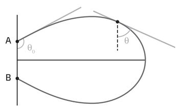 7. Форма, принимаемая упругим стержнем, концы которого зафиксированы в A и B, называется кривой Эйлера. Угол Ѳ между касательной и прямой AB позволяет определить кривизну dѲ/ds, производную от Ѳ относительно пути, пройденного по кривой. Эйлерова кривая минимизирует среднюю квадратичную кривизну стержня, то есть минимизирует интеграл ∫(dѲ/ds)2ds, где Ѳ — угол между касательной и некоторым выбранным направлением, а s — длина вдоль кривой. Интеграл берется вдоль всего стержня