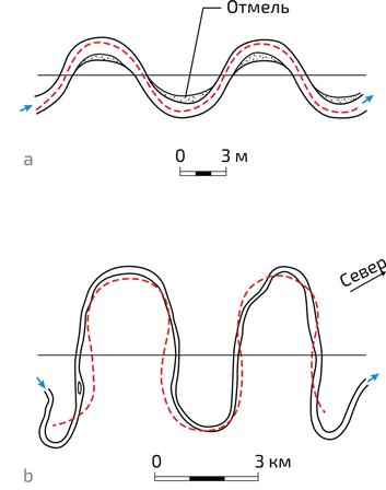 Это заключение согласуется с ранее проведенными лабораторными экспериментами, в которых моделировался процесс эволюции русла реки «в идеальных условиях». Оказалось, что в изначально прямолинейном русле очень быстро образуются меандры, хорошо описываемые кривой Эйлера (илл. 8a). Очевидно, что в природе поведение русла реки существенно сложнее «лабораторного» русла (например, из-за неровной местности). И все же подобные структуры, обычно периодические, возникают естественным образом, когда река течет по равнине (илл. 8b). Как правило, чем шире река, тем больше на ней излучин.