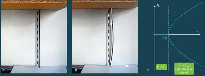 Возьмем плоскую пластиковую линейку, поставим ее на стол и надавим на верхний конец. Пока приложенная сила невелика, линейка остается прямой (см. илл. ниже). Но при определенном давлении линейка сгибается: это явление называется продольным изгибом. Оно возникает, когда сила, действующая на концы, превышает некоторый предел, который тем ниже, чем длиннее и гибче линейка. Очевидно, архитекторы и строители не должны превышать этот предел, когда, например, подпирают террасу металлическими опорами…