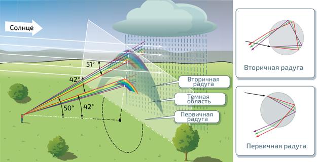 9. Путь световых лучей в основной и вторичной радугах. Средний угол отклонения — 42° и 51° соответственно. Впоследствии лучи света, составляющие основную радугу, образуют конус вращения, осью которого является прямая «Солнце — наблюдатель», а угол между ней и образующими составляет 42°
