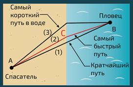 Спасатель (А), которому нужно как можно скорее спасти пловца (B), бежит по пляжу быстрее, чем плывет в море. Самый краткий путь, прямой (1), не будет самым быстрым: спасатель потеряет много времени в море. Если же он максимально сократит время плавания (3), то значительно увеличит путь по пляжу. В итоге самый быстрый путь (2), проходящий через C, — тот, который отвечает закону Снеллиуса