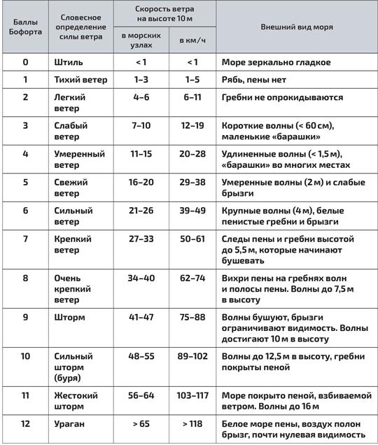 Количество «барашков» и высота волн зависят от скорости ветра. Эта информация имеет важное значение для моряков: для определения скорости ветра они пользуются эмпирической таблицей, которую разработал британский адмирал сэр Фрэнсис Бофорт (1774–1857) (см. главу 2). На картине Рылова наличие небольшого количества «барашков» свидетельствует о ветре 12–19 км/ч, то есть 7–10 морских узлов. Такой ветер считается слабым и соответствует силе в 3 балла по шкале Бофорта.