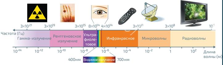 Различные области электромагнитного излучения и их применение. Узкая область между 400 и 800 нм (то есть на частотах между 800 и 400 ТГц) соответствует видимому спектру. Каждое излучение, или «спектральный цвет», обладает своей длиной волны λ, которая связана с частотой υ отношением λ = c/υ, где c — скорость света в вакууме