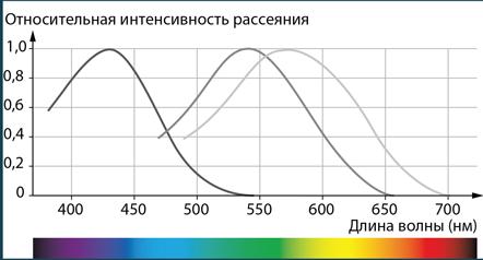 Как все это связано с цветом неба? Согласно закону Рэлея, рассеяние электромагнитных волн оказывается значительно интенсивнее для высоких частот по сравнению с низкими. Это означает, что молекулы атмосферы сильнее рассеивают синий цвет, чем красный, зеленый или желтый. Таким образом, наших глаз преимущественно достигают именно световые лучи синего цвета. Вот почему небо синее! Следуя этому рассуждению, можно было бы предположить, что небо должно быть фиолетовым, так как фиолетовое излучение обладает более высокой частотой, чем синее. В действительности в спектре солнечного излучения доля фиолетового меньше, чем синего. Кроме того, и максимальная чувствительность человеческого глаза находится в области зеленого (555 нм). В результате фиолетовая часть спектра солнечного излучения оказывается подавленной в восприятии человеческого глаза, и небо видится синим (см. главу 3, «Цветовое зрение»).