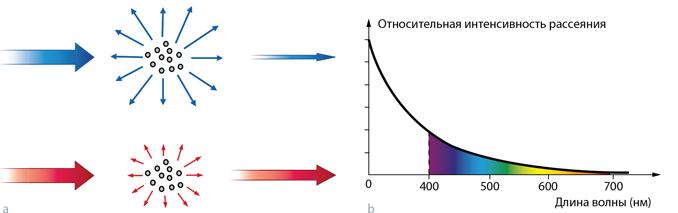 2. Рассеяние света молекулами и закон Рэлея. Под воздействием падающего монохроматического света (a) молекулы переизлучают свет той же длины волны во всех направлениях. Синему цвету соответствует длина волны около 450 нм, а красному — около 650 нм. (b) Согласно закону Рэлея, четвертая степень отношения 650/450 равна 4,3, то есть интенсивность рассеяния синего примерно в 4 раза выше, чем красного