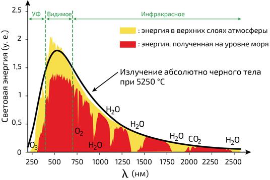 4. Световая энергия, получаемая верхними слоями атмосферы (желтый) и на уровне моря (красный) в дневное время с учетом рассеяния и поглощения. Отметки «H2O» и «O2» обозначают диапазон поглощения воды и кислорода соответственно. Энергия, отложенная по оси ординат, выражается в ваттах на кв. м поверхности, в то время как длины волн на оси абсцисс измеряются в нанометрах