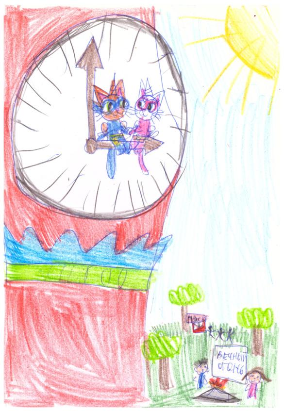 Куранты пробили и стрелка, на которой сидели котята покачнулась. Котята съехали вниз. Но тут же полетели (чтоб не упасть). И молнией бросились вниз. Вроде все говорили, что здесь страшная катастрофа, а на первый взгляд ее здесь и нет. Котята решили остаться здесь до послезавтра. Если ничего не случится, они летят домой. Котята перелетели на Собор Василия Блаженного и уселись там на куполах.
