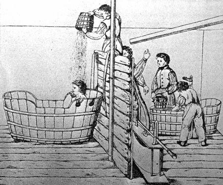 Рис. 2. Обливание водой (фрагмент старинного рисунка). Считалось, что таким образом можно успокоить буйных сумасшедших