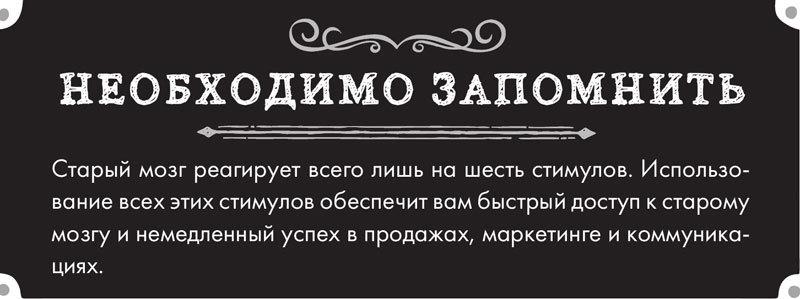 Сейчас вы знаете все шесть стимулов, которые оказывают влияние на старый мозг. Эти стимулы носят универсальный характер и поэтому имеют огромную силу. Помня об этих ключевых ингредиентах, любой специалист в сфере продаж и маркетинга успешно создаст рецепт успеха.