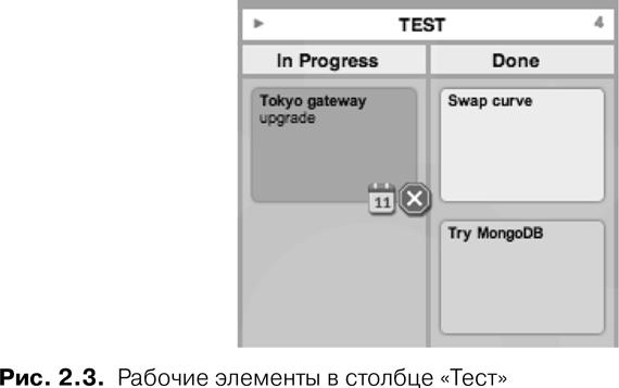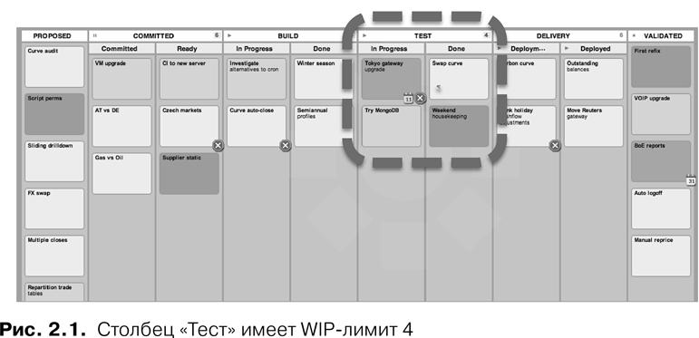 Рассмотрим ситуацию на доске (рис. 2.2) с точки зрения людей, наиболее тесно связанных с этими самыми столбцами «Тест». Они могут быть тестировщиками или теми самыми разработчиками или аналитиками, которые занимались этими участками работы на более ранних стадиях; в интересах самоорганизации на доске это не отражается. Однако доска позволяет убедиться в том, что объем работы в этой зоне не выйдет (или не должен выйти) за пределы возможностей.